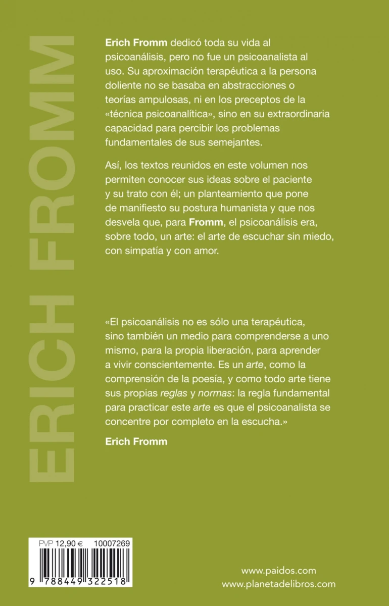 Los textos publicados por primera vez en este volumen no son un manual de terapéutica psicoanalítica, ni sirven para suplir la falta de testimonios de Erich Fromm sobre la llamada técnica psicoanalítica, sino que están principalmente dedicados a ofrecer información sobre el Fromm terapeuta y su forma de trato con el hombre "doliente" de nuestro tiempo: una relación terapéutica acaba...