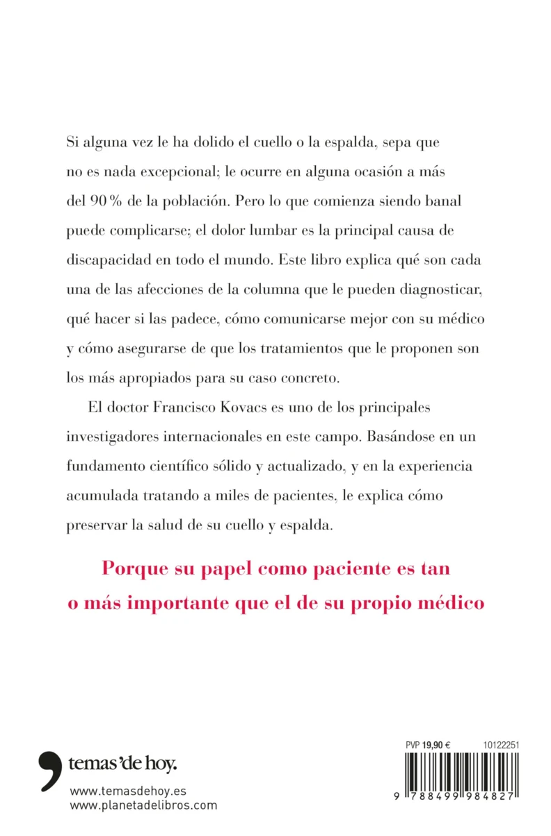 Si alguna vez le ha dolido el cuello o la espalda, sepa que no es nada excepcional; le ocurre en alguna ocasión a más del 90 % de la población. Pero lo que comienza siendo banal puede complicarse; el dolor lumbar es la principal causa de discapacidad en todo el mundo. Este libro explica qué son cada una de...