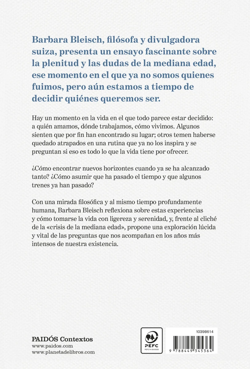 Barbara Bleisch, filósofa y divulgadora suiza, presenta un ensayo fascinante sobre la plenitud y las dudas de la mediana edad, ese momento en el que ya no somos quienes fuimos, pero aún estamos a tiempo de decidir quiénes queremos ser.