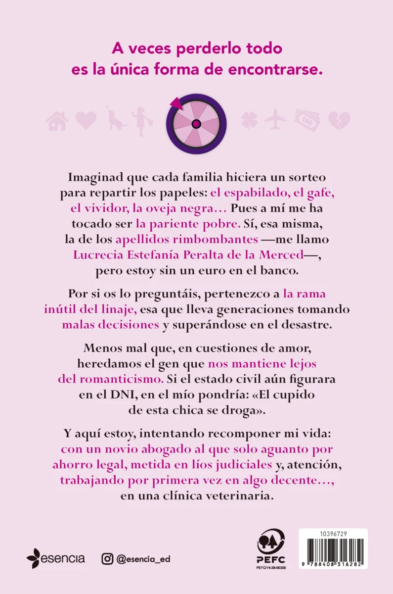 Imaginad que cada familia hiciera un sorteo para repartir los papeles: el espabilado, el gafe, el vividor, la oveja negra… Pues a mí me ha tocado ser la pariente pobre. Sí, esa misma, la de los apellidos rimbombantes —me llamo Lucrecia Estefanía Peralta de la Merced—, pero estoy sin un euro en el banco.