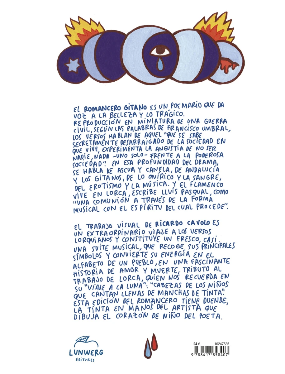 «Una cuidada edición de los versos del poeta, recreados con el particular universo de ojos, colores y fuego tatuado de Cavolo. La curiosa conversación entre los dos autores, sus mundos y sus generaciones, da lugar a una obra única, un ejercicio de expresionismo que permite la lectura más diferente del clásico de Lorca».