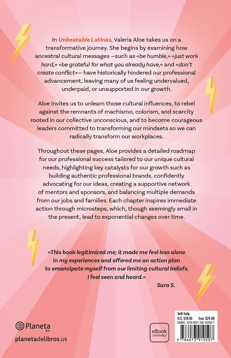 In Unbeatable Latinas, Valeria Aloe takes us on a transformative journey. She begins by examining how ancestral cultural messages —such as «be humble,» «just work hard,» «be grateful for what you already have,» and «don’t create conflict»— have historically hindered our professional advancement, leaving many of us feeling...